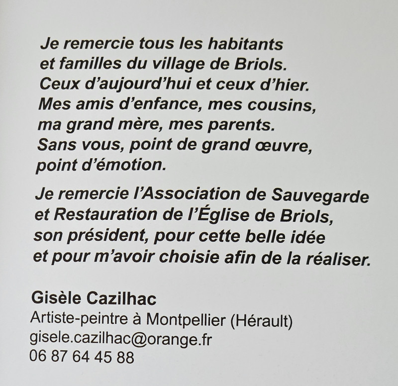 Créées à la demande de l'association par l'artiste peintre Gisèle CAZILHAC, des oeuvres sont exposées de manière permanente sur les murs de l'église de Briols.