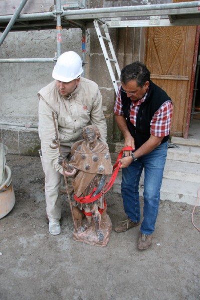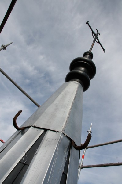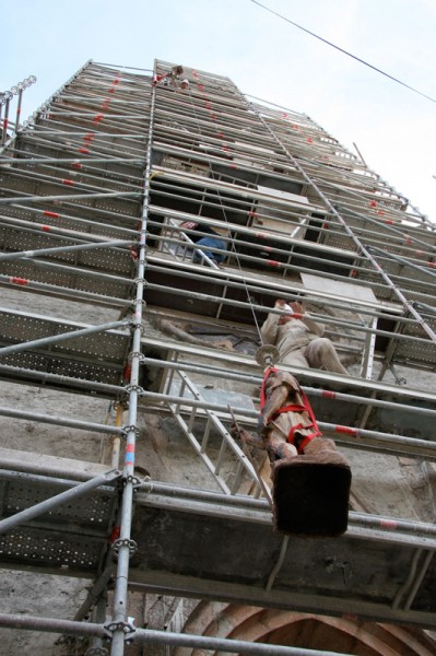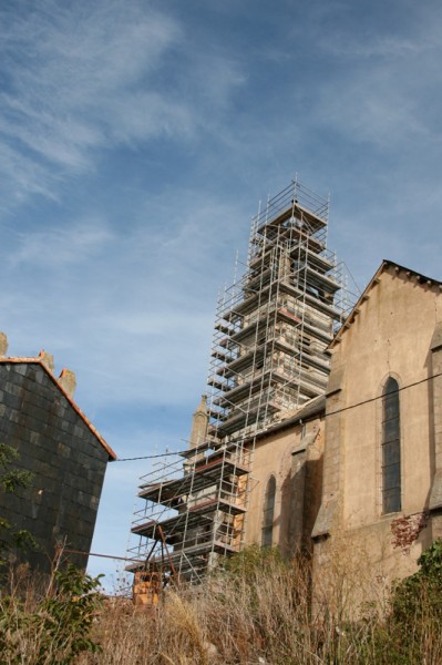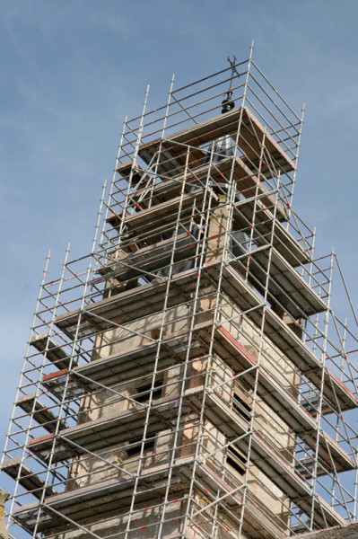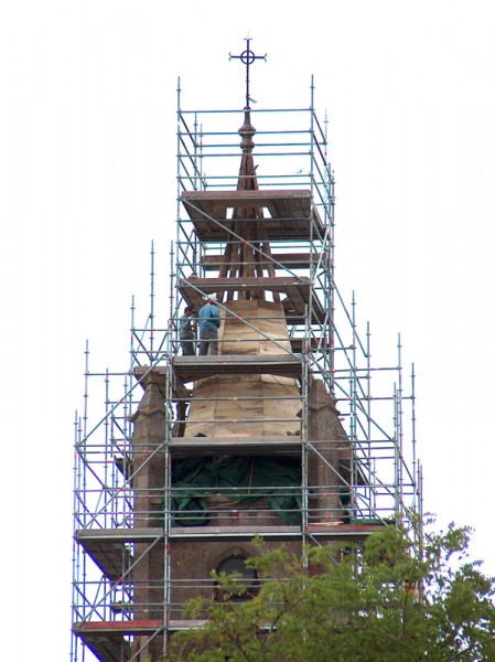 "Aujourd’hui, Vendredi 29 Juin, commence le chantier de la rénovation du clocher, par la mise en place des echaffaudages. Avec un petit décalage par rapport à ce qui avait été prévu : “début Juin” ; mais, c’est peu de chose devant la durée pendant laquelle l’église se sera continuement dégradée..."